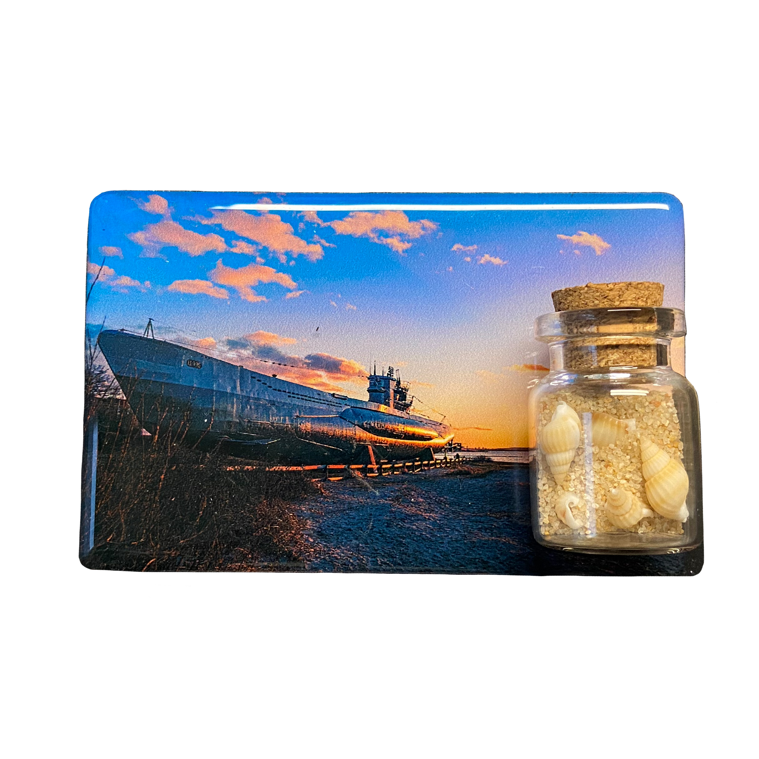 Ein bedruckter Kühlschrankmagnet mit einem Glasfläschen voll Sand und Muscheln. Motiv: „Technisches Museum U 995“.